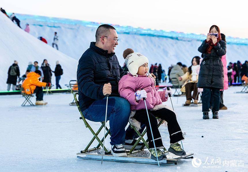 游客在第五届呼和浩特欢乐冰雪节活动现场体验滑冰车。丁根厚摄
