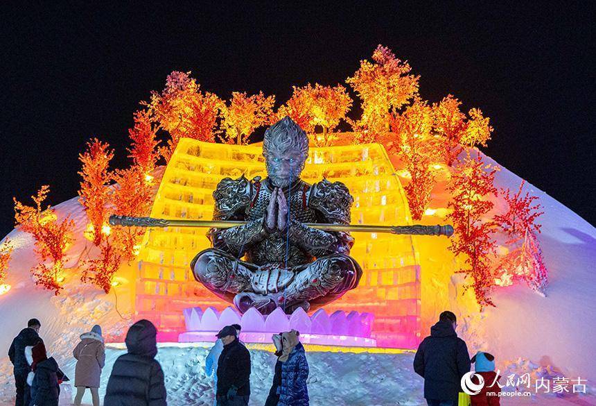 游客在第五届呼和浩特欢乐冰雪节活动现场观赏“黑悟空”冰雕。丁根厚摄