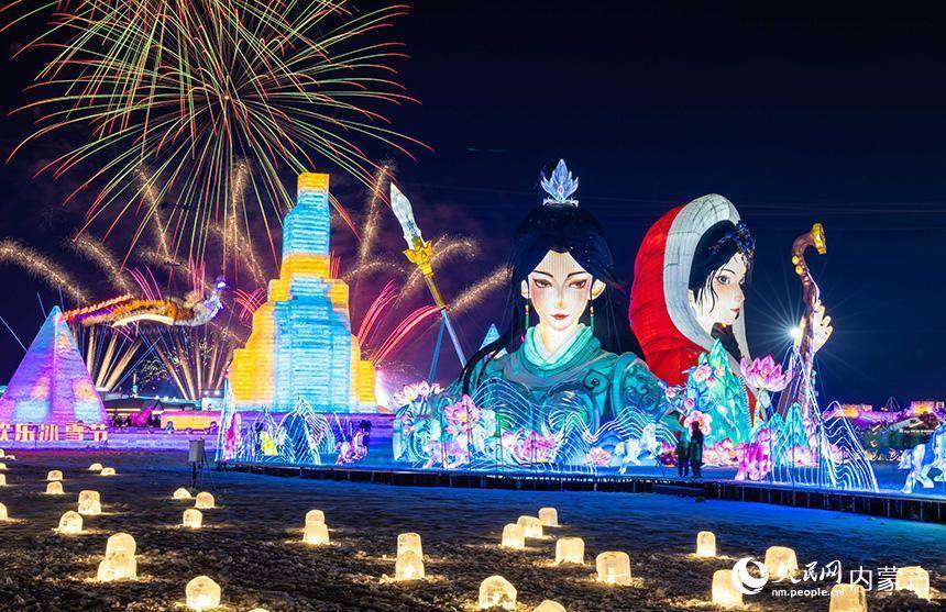 第五届呼和浩特欢乐冰雪节现场,烟花绽放,“花木兰”“王昭君”主题花灯与冰雕交相辉映,璀璨夺目。丁根厚摄