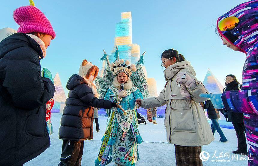 歌手在第五届呼和浩特欢乐冰雪节现场与游客互动。丁根厚摄