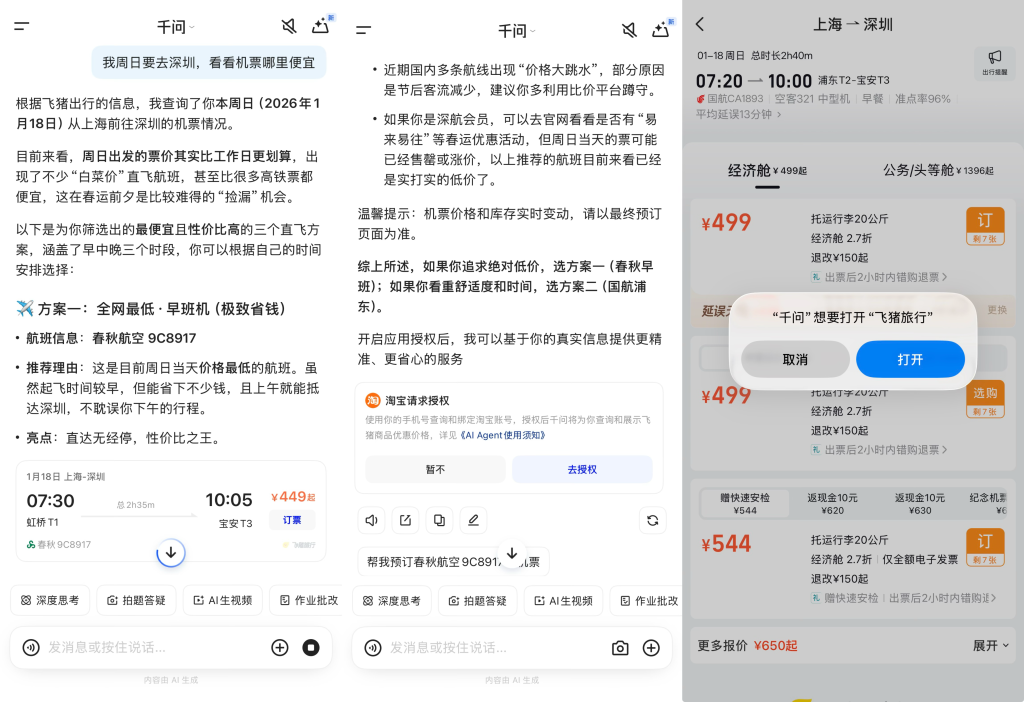 在千问界面中,如果询问机票情况,可以看到会给出多种选项,并可以进行跳转操作。需要注意的是,接入其他应用需要用户同意授权。