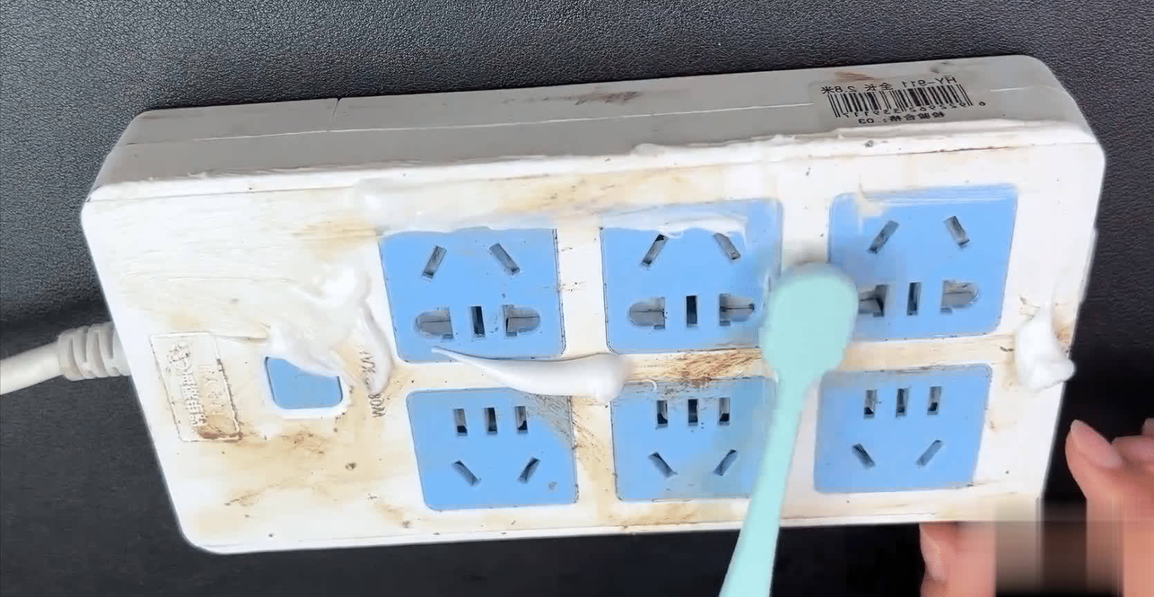 这时就可以在插座表面挤上一点牙膏,然后偷偷拿出老公用的牙刷来,在插座表面刷一下,插座表面的污渍就可以去除干净,然后再找一块干的抹布,把插座表面剩余的牙膏擦掉,就可以清洁干净了。因为我们清理插座时,没有用一滴水,非常安全,不用担心发生触电危险。